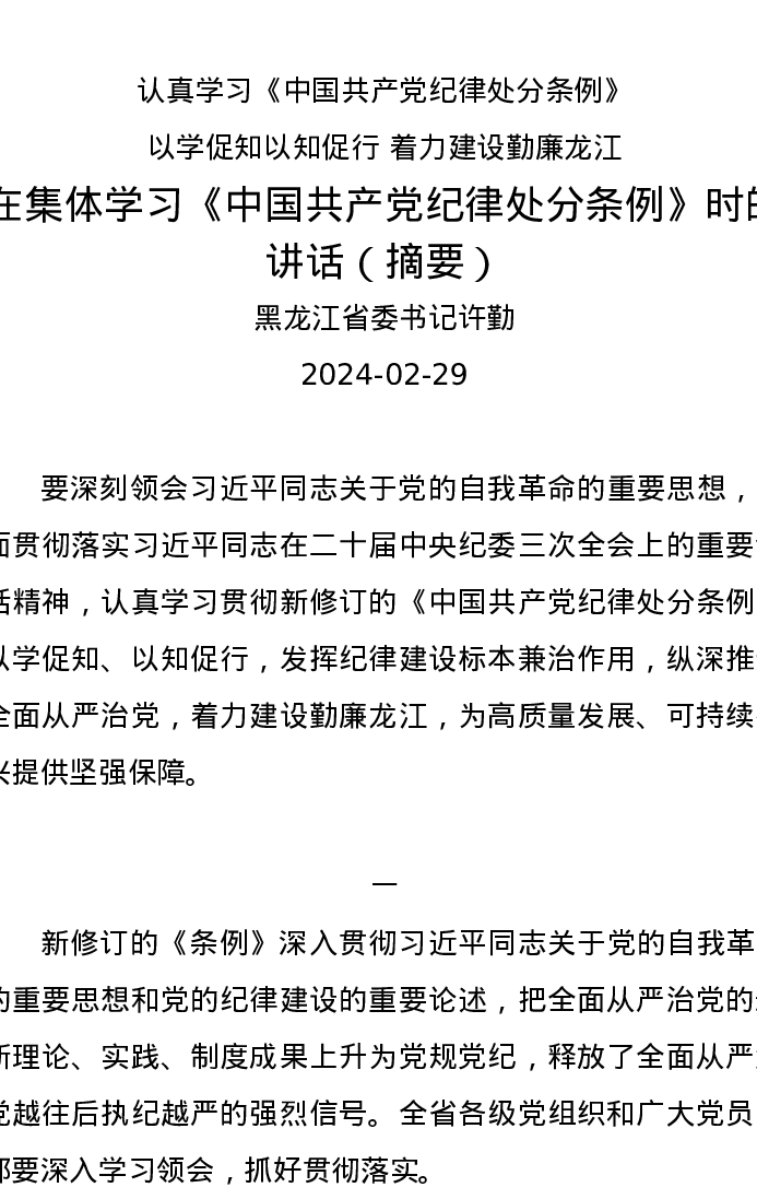 党纪学习教育∣03领导讲话:在集体学习《中国共产党纪律处分条例》时的讲话(摘要)——黑龙江省委书记许勤