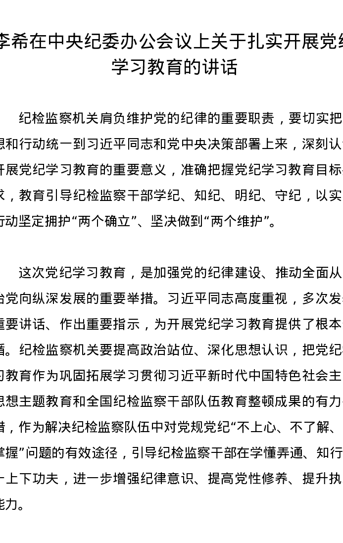 党纪学习教育∣03领导讲话:李希在中央纪委办公会议上关于扎实开展党纪学习教育的讲话
