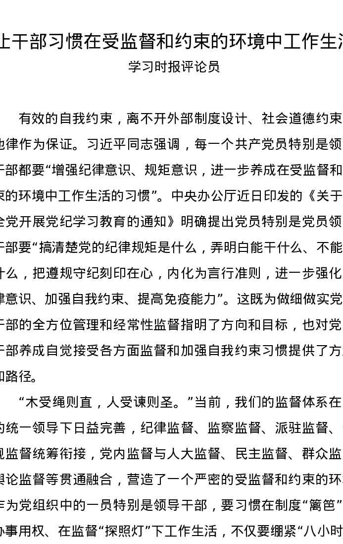 党纪学习教育∣06评论文章:让干部习惯在受监督和约束的环境中工作生活