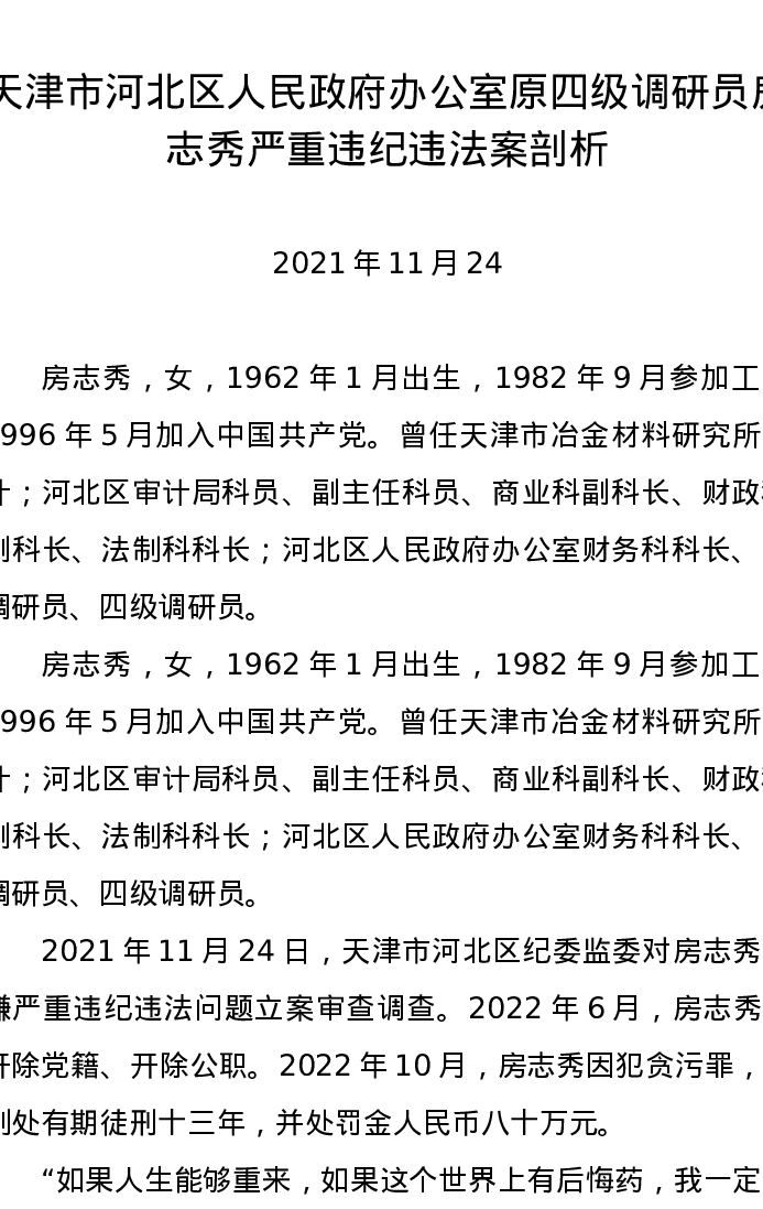 党纪学习教育∣07案例剖析:天津市河北区人民政府办公室原四级调研员房志秀严重违纪违法案剖析