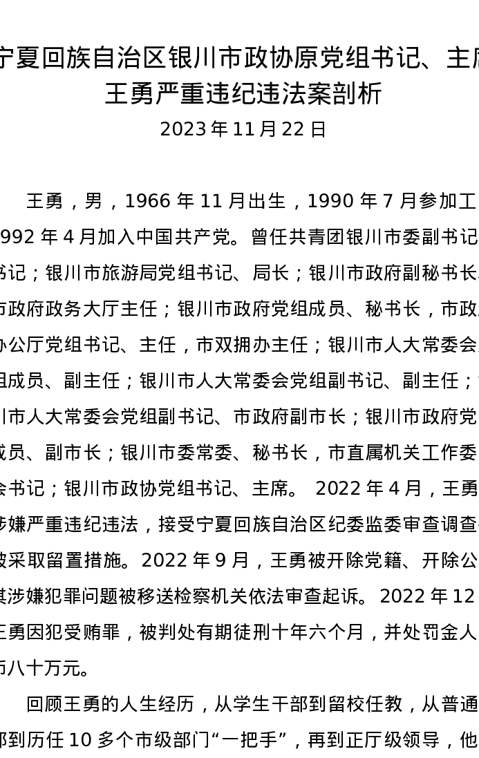 党纪学习教育∣07案例剖析:宁夏回族自治区银川市政协原党组书记、主席王勇严重违纪违法案剖析