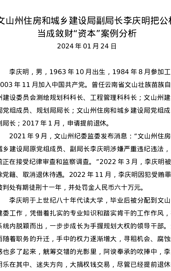 党纪学习教育∣07案例剖析:文山州住房和城乡建设局副局长李庆明把公权当成敛财“资本”案例分析