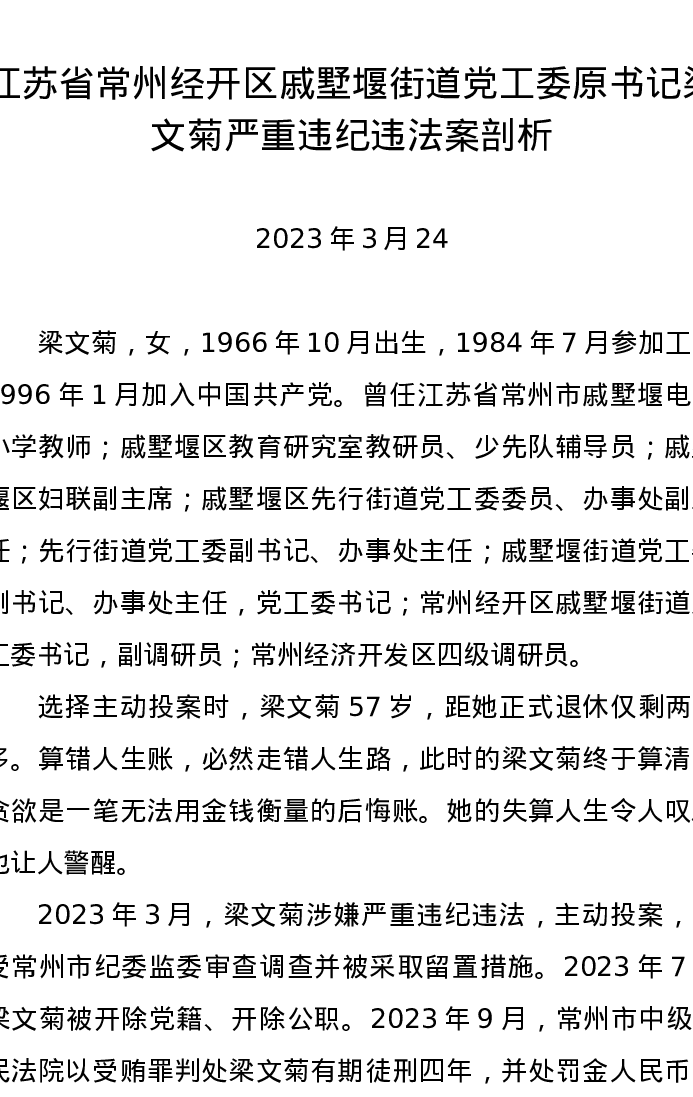 党纪学习教育∣07案例剖析:江苏省常州经开区戚墅堰街道党工委原书记梁文菊严重违纪违法案剖析