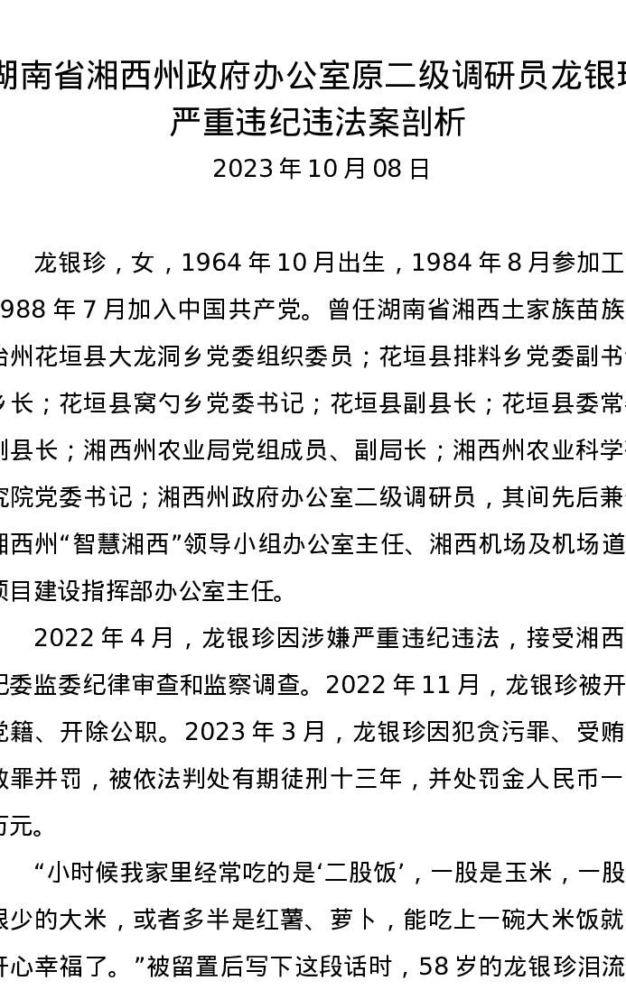 党纪学习教育∣07案例剖析:湖南省湘西州政府办公室原二级调研员龙银珍严重违纪违法案剖析