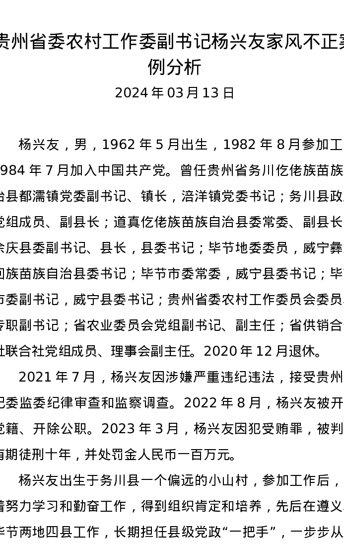 党纪学习教育∣07案例剖析:贵州省委农村工作委副书记杨兴友家风不正案例分析