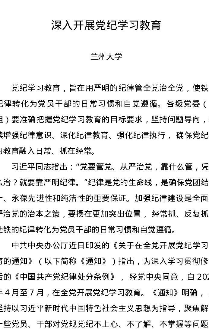 党纪学习教育∣08党课讲稿:深入开展党纪学习教育——兰州大学