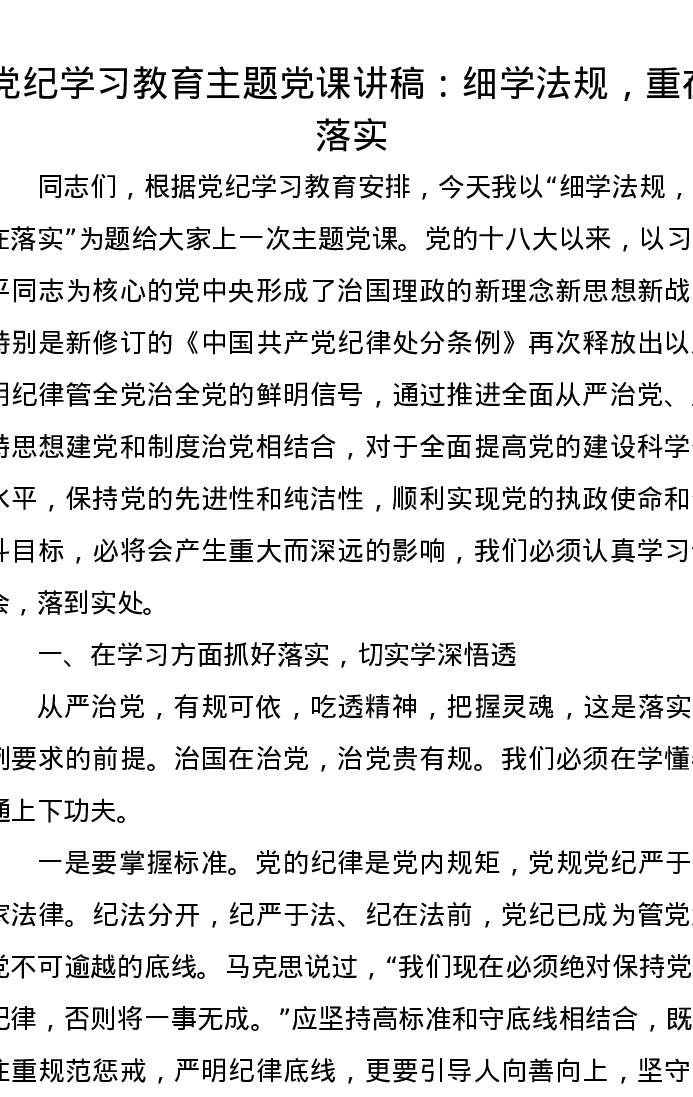 党纪学习教育主题党课讲稿:细学法规,重在落实