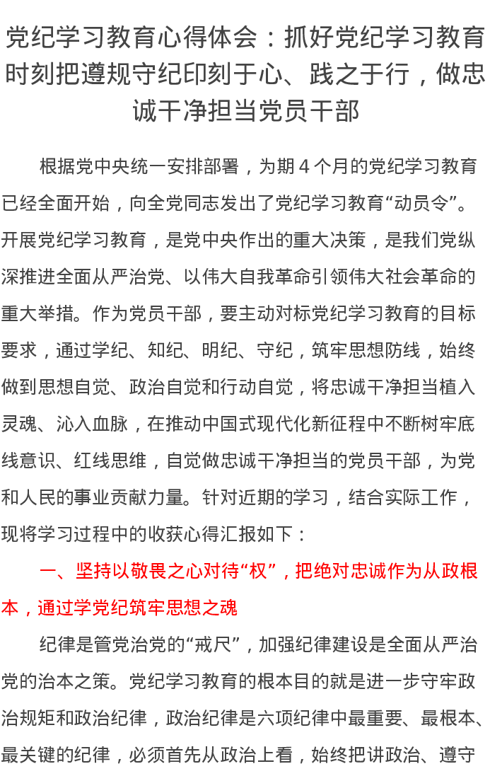 党纪学习教育心得体会:抓好党纪学习教育,时刻把遵规守纪印刻于心、践之于行,做忠诚干净担当党员干部