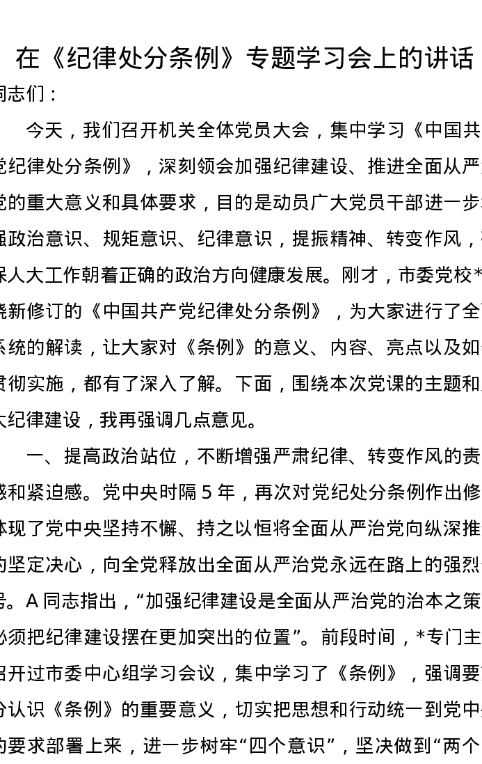 党纪学习教育:在《纪律处分条例》专题学习会上的讲话