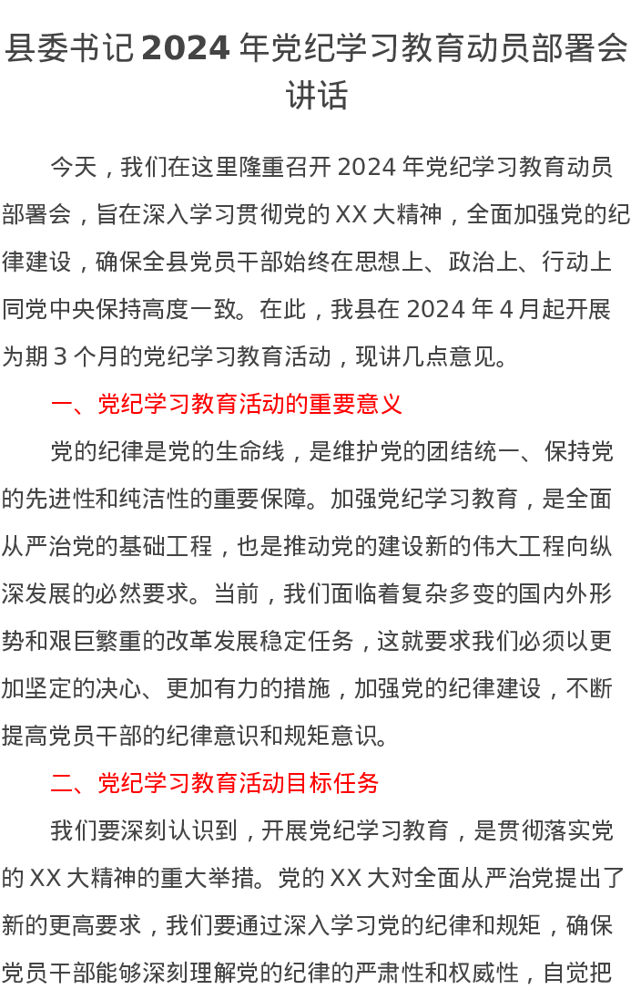 县委书记2024年党纪学习教育动员部署会讲话