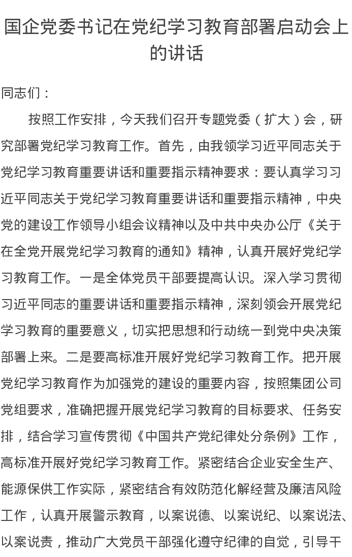 国企党委书记在党纪学习教育部署启动会上的讲话
