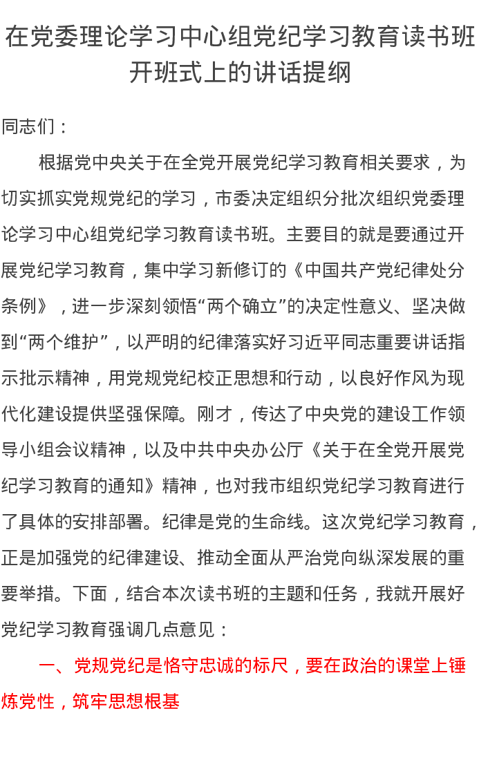 在党委理论学习中心组党纪学习教育读书班开班式上的讲话提纲