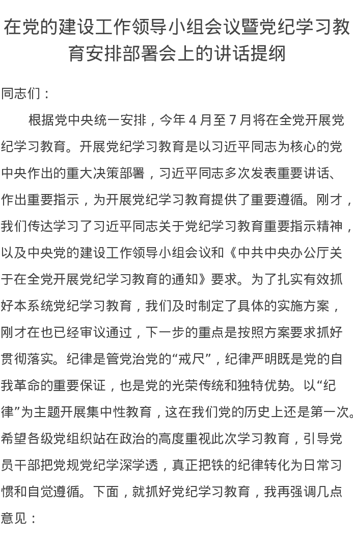 在党的建设工作领导小组会议暨党纪学习教育安排部署会上的讲话提纲