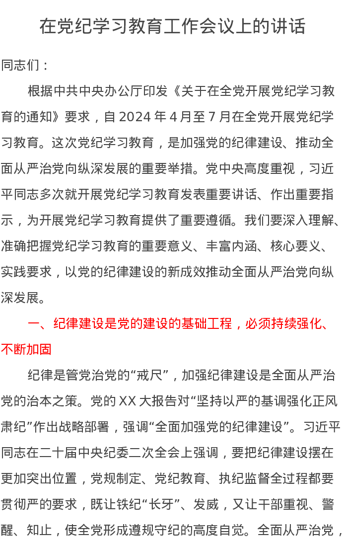在党纪学习教育工作会议上的讲话