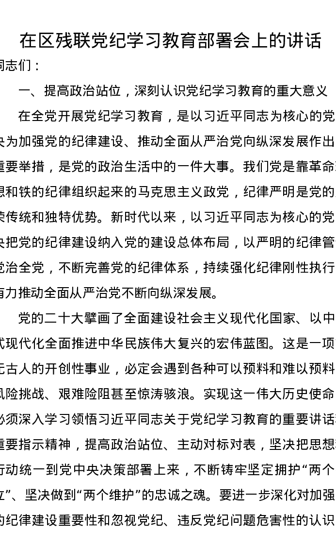 在区残联党纪学习教育部署会上的讲话