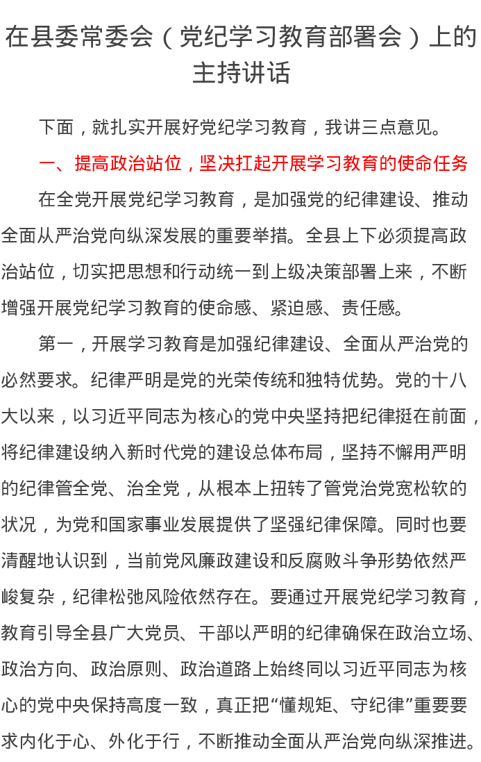 在县委常委会(党纪学习教育部署会)上的主持讲话