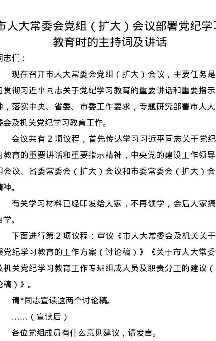 市人大常委会党组(扩大)会议部署党纪学习教育时的主持词及讲话
