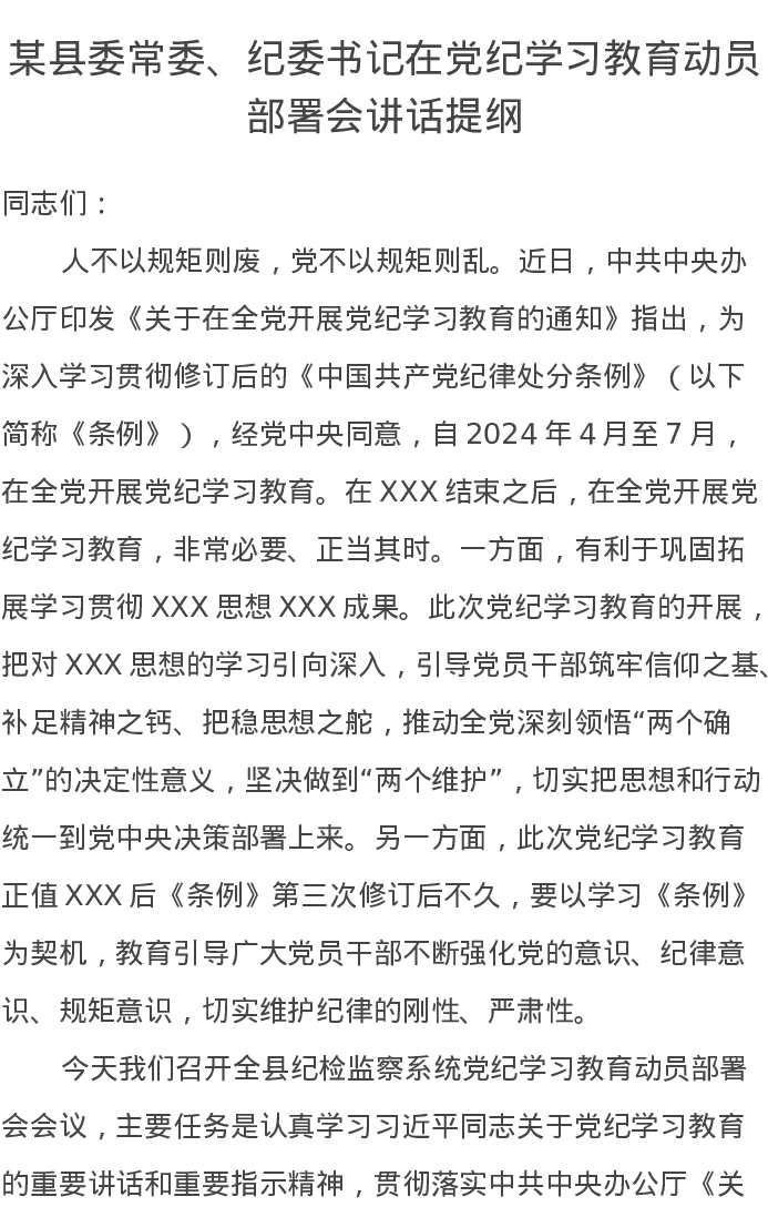 某县委常委、纪委书记在党纪学习教育动员部署会讲话提纲