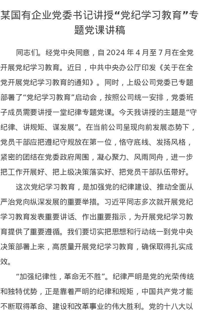 某国有企业党委书记讲授“党纪学习教育”专题党课讲稿