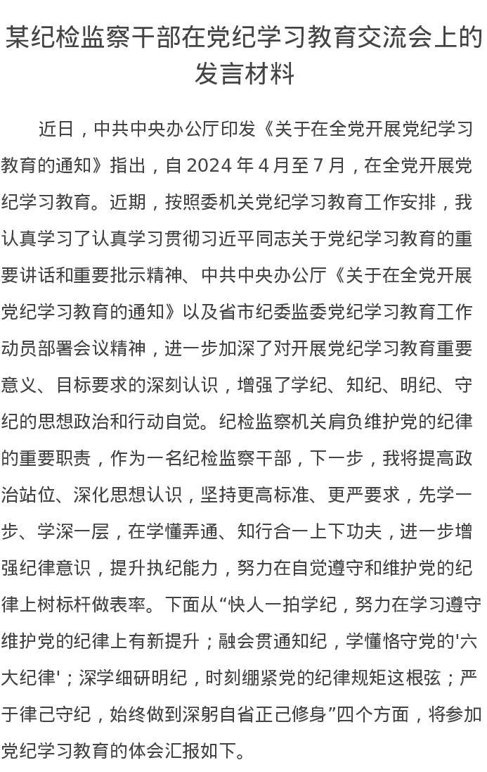 某纪检监察干部在党纪学习教育交流会上的发言材料