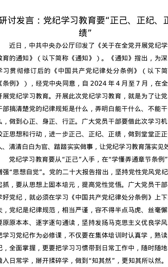 研讨发言:党纪学习教育要“正己、正纪、正绩”