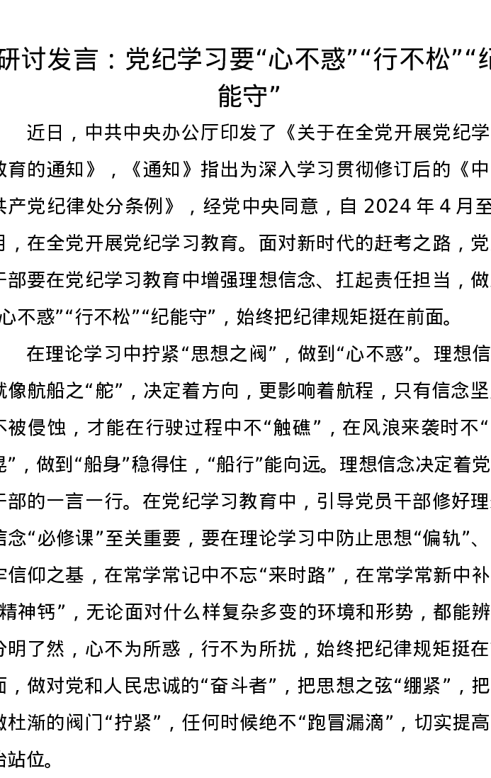 研讨发言:党纪学习要“心不惑”“行不松”“纪能守”