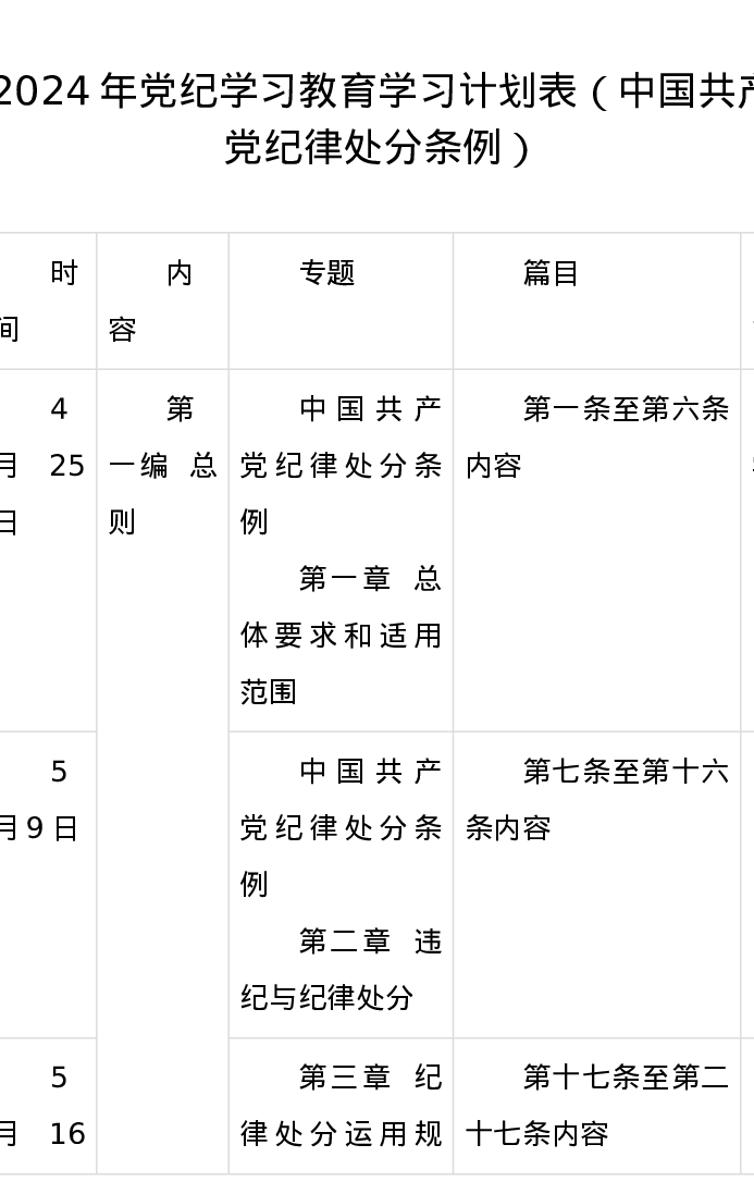 2024年党纪学习教育学习计划表(中国共产党纪律处分条例)