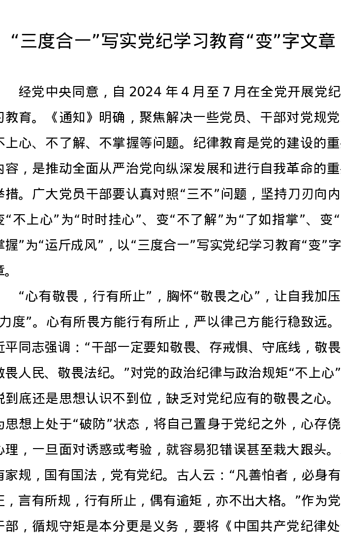 党纪学习教育∣09学习交流:20240411“三度合一”写实党纪学习教育“变”字文章