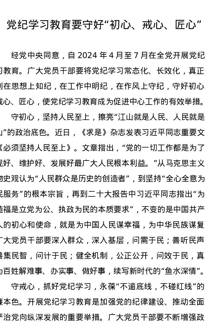 党纪学习教育∣09学习交流:20240411党纪学习教育要守好“初心、戒心、匠心”
