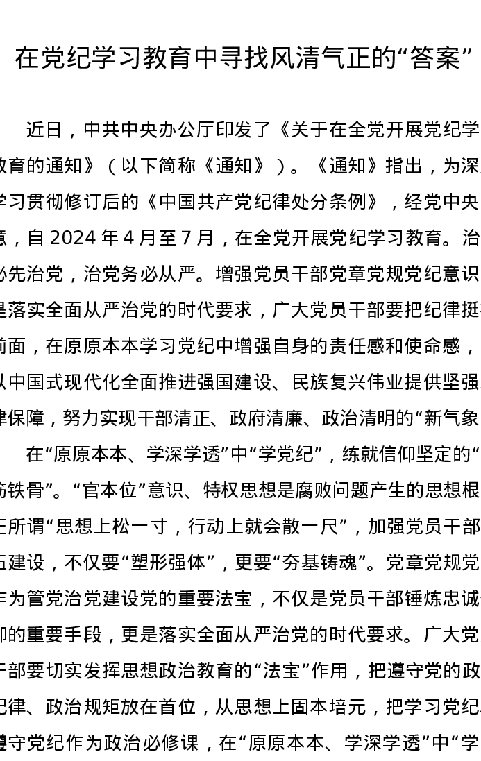 党纪学习教育∣09学习交流:20240411在党纪学习教育中寻找风清气正的“答案”