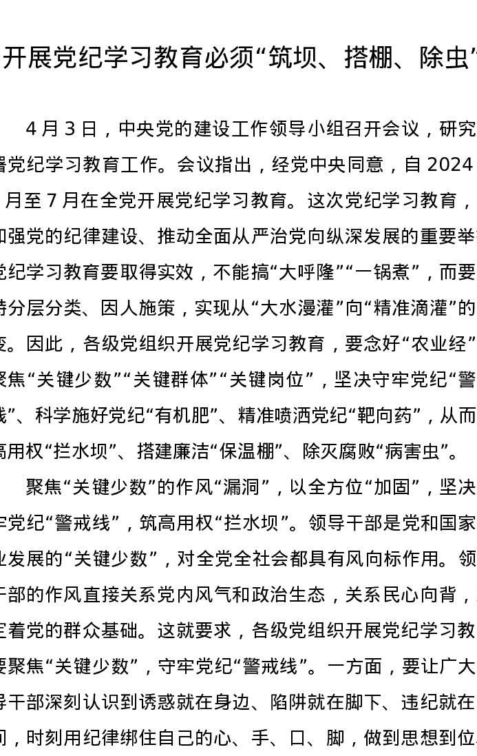 党纪学习教育∣09学习交流:20240412开展党纪学习教育必须“筑坝、搭棚、除虫”