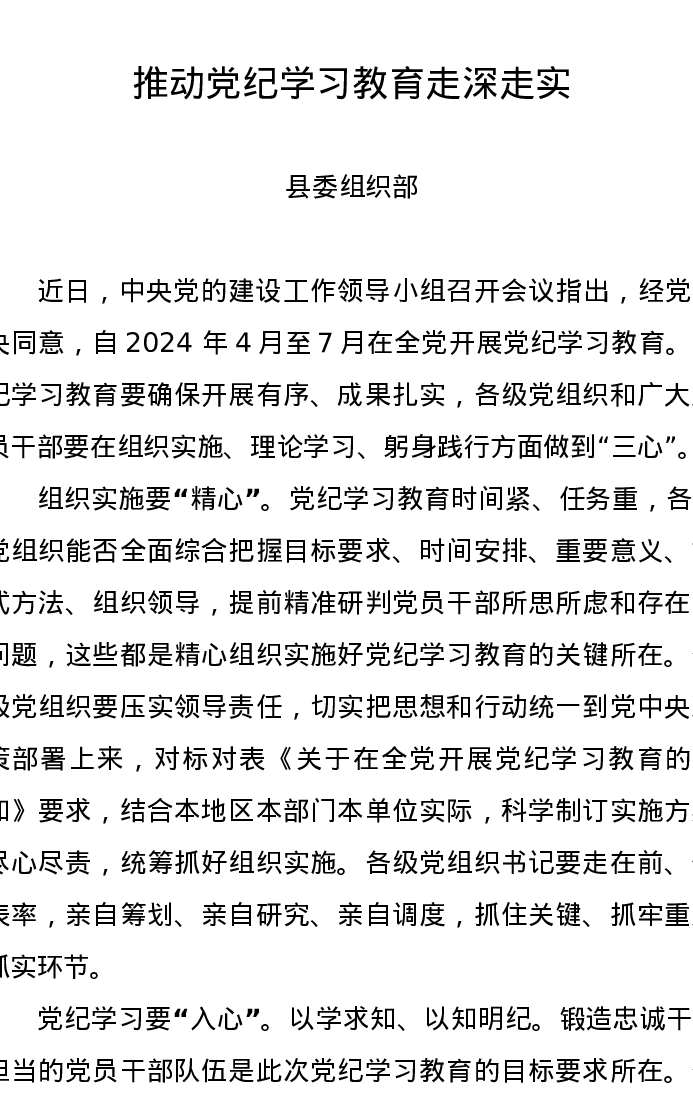 党纪学习教育∣09学习交流:20240414推动党纪学习教育走深走实(县委组织部)