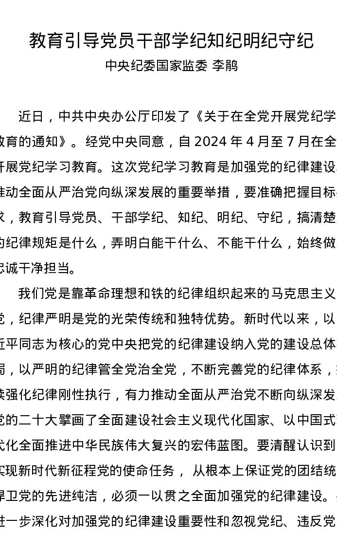 党纪学习教育∣09学习交流:20240414教育引导党员干部学纪知纪明纪守纪(中央纪委国家监委 李鹃)