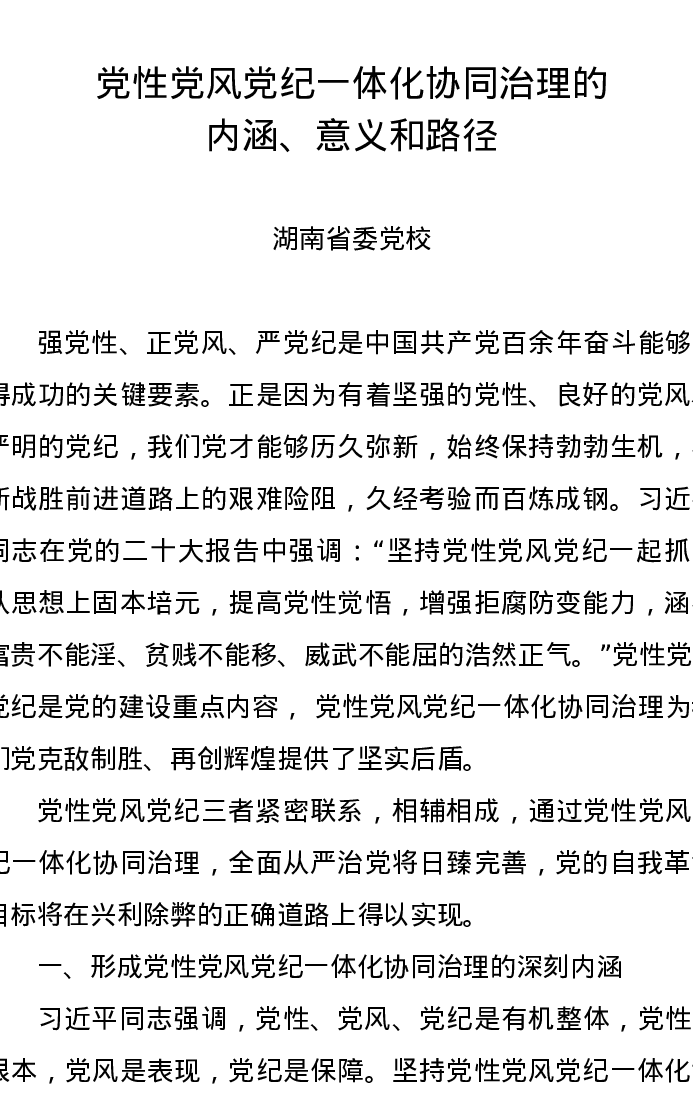 党纪学习教育∣11拓展学习:党性党风党纪一体化协同治理的内涵、意义和路径(湖南省委党校)