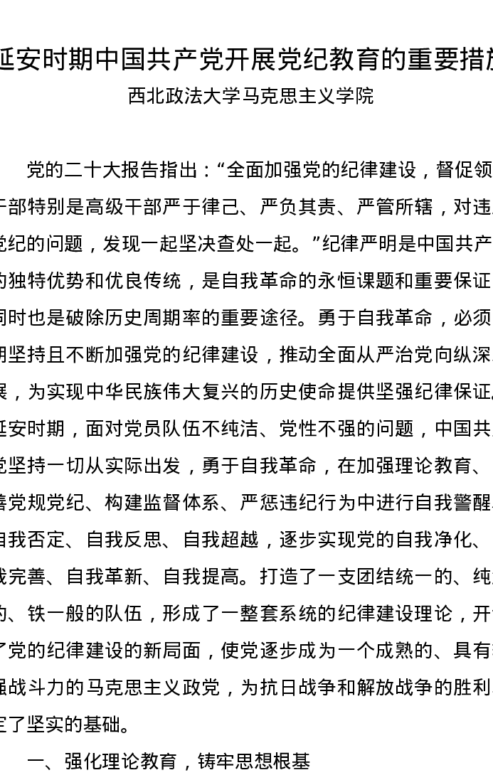 党纪学习教育∣11拓展学习:延安时期中国共产党开展党纪教育的重要措施(西北政法大学马克思主义学院)