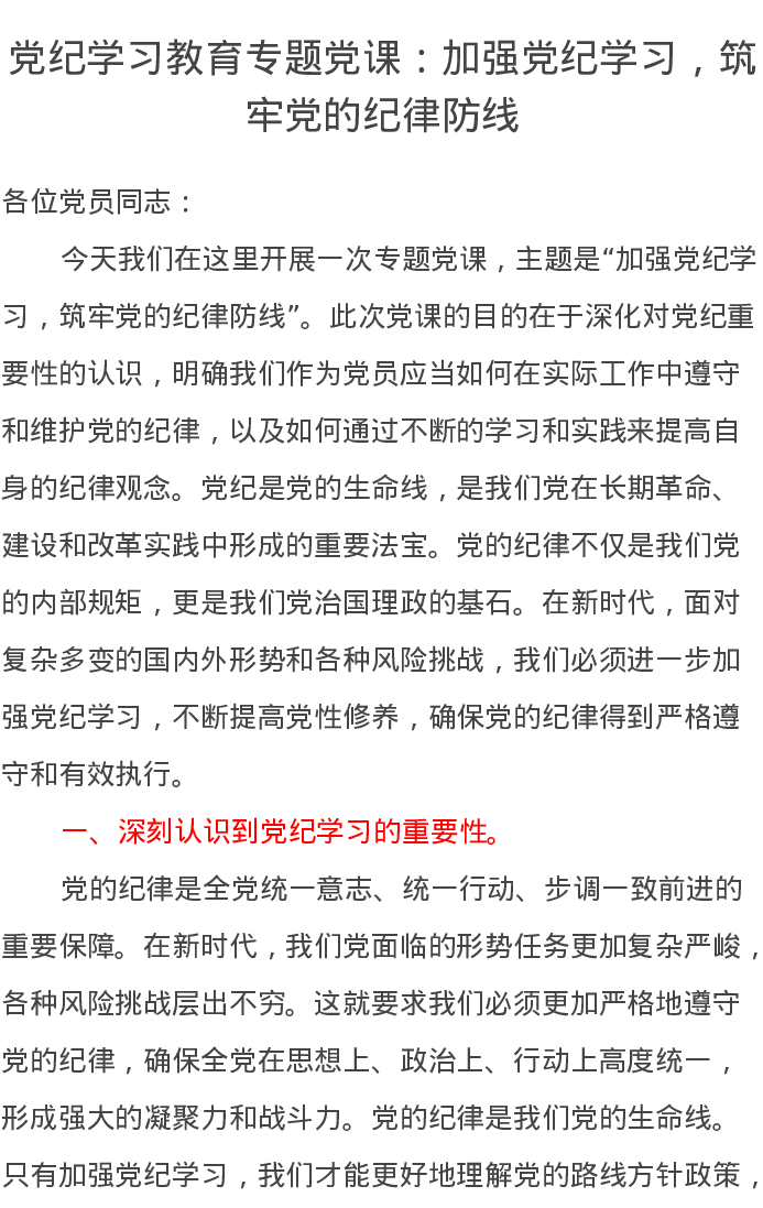 党纪学习教育专题党课:加强党纪学习,筑牢党的纪律防线