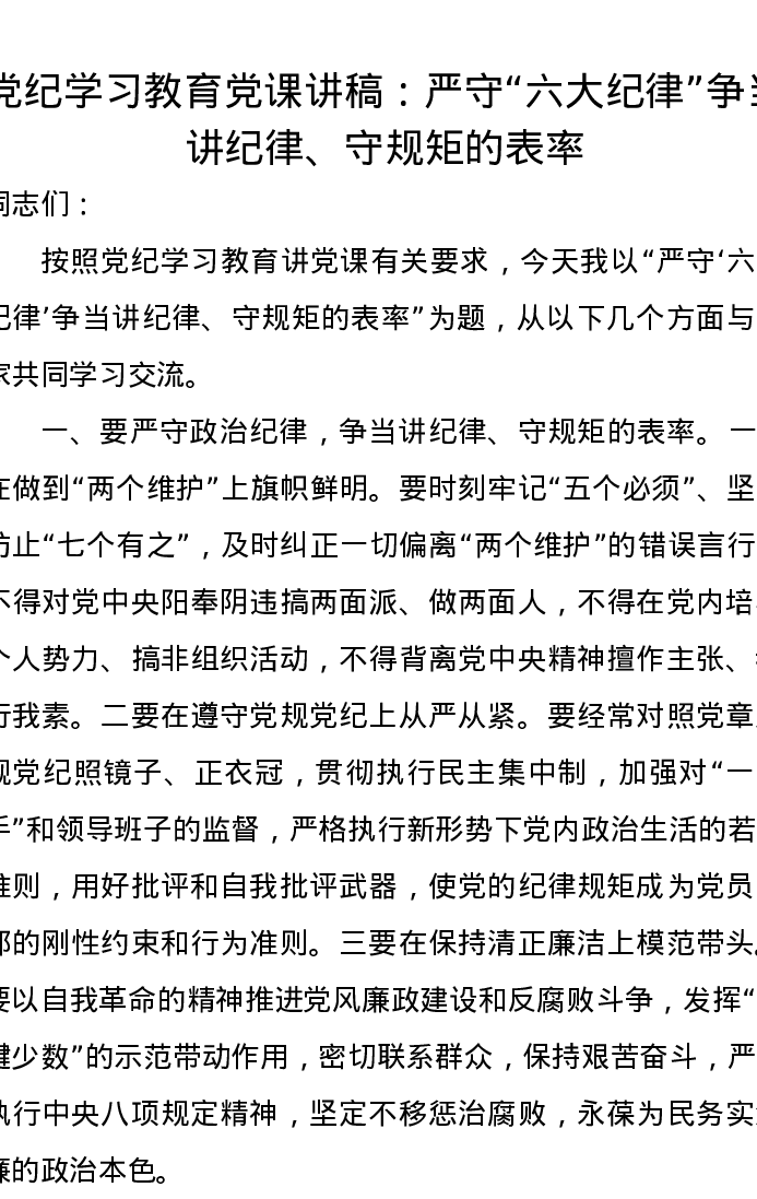 党纪学习教育党课讲稿:严守“六大纪律”争当讲纪律、守规矩的表率