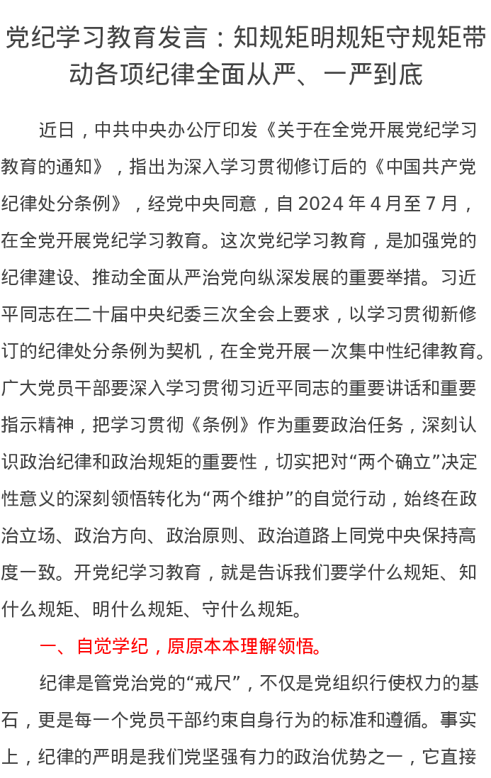 党纪学习教育发言:知规矩明规矩守规矩带动各项纪律全面从严、一严到底