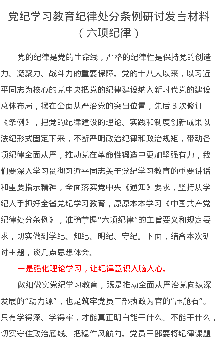 党纪学习教育纪律处分条例研讨发言材料(六项纪律)