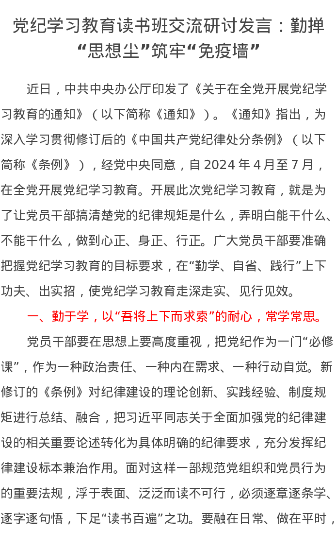 党纪学习教育读书班交流研讨发言:勤掸“思想尘”筑牢“免疫墙”