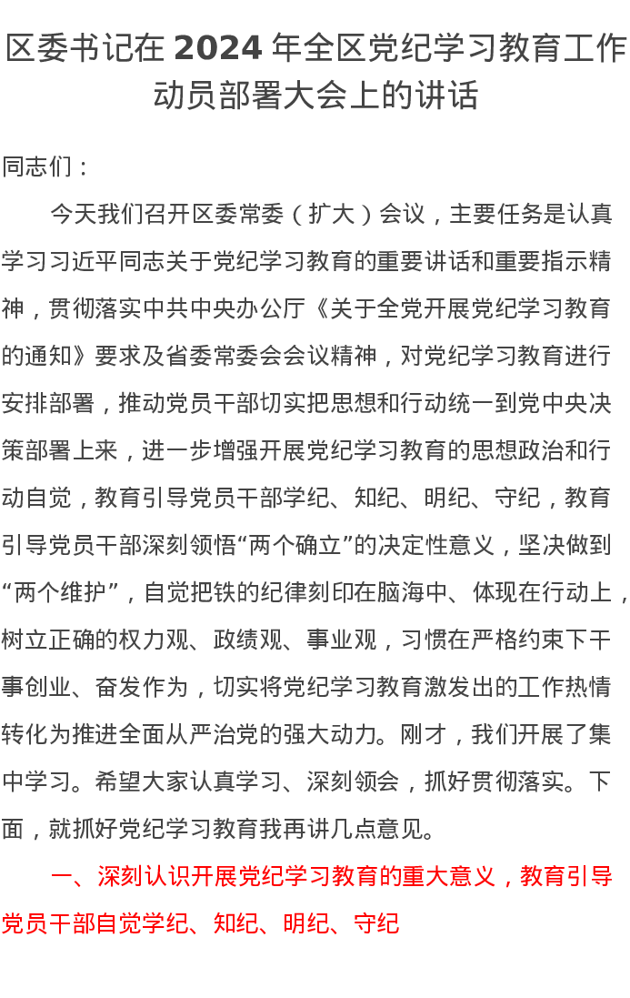 区委书记在2024年全区党纪学习教育工作动员部署大会上的讲话