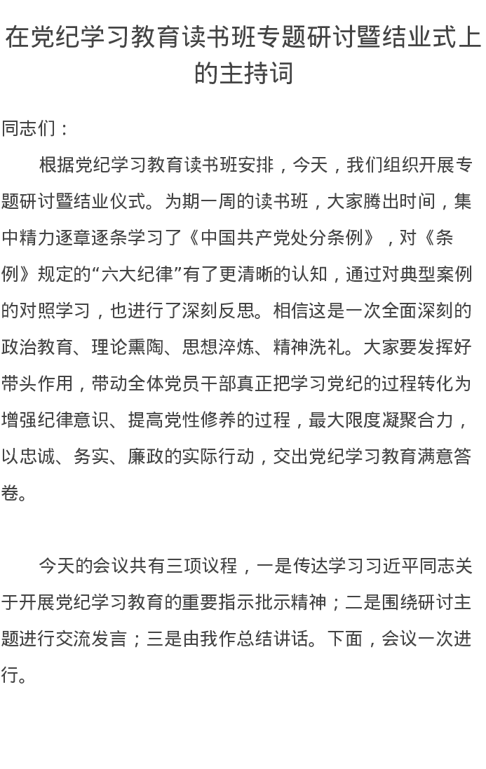 在党纪学习教育读书班专题研讨暨结业式上的主持词