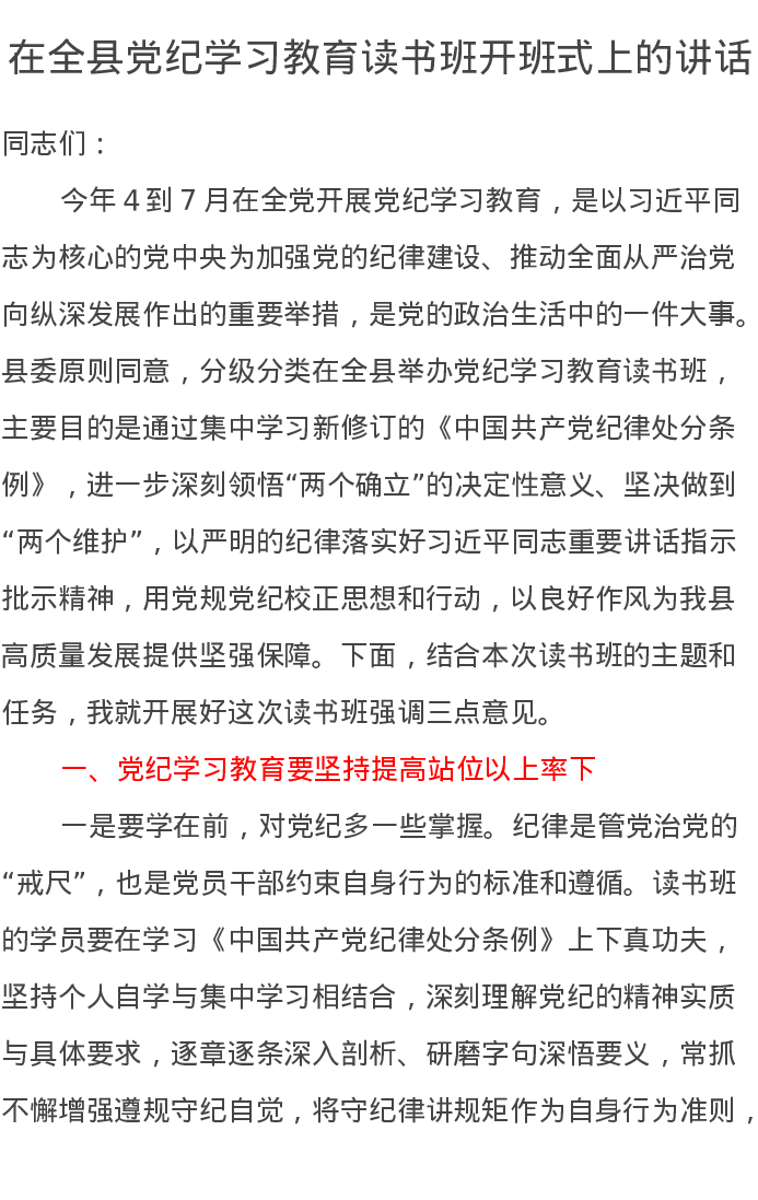 在全县党纪学习教育读书班开班式上的讲话