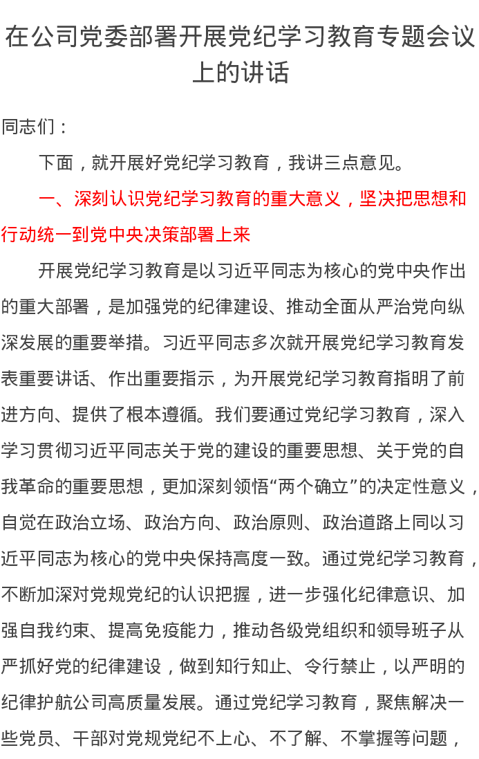 在公司党委部署开展党纪学习教育专题会议上的讲话