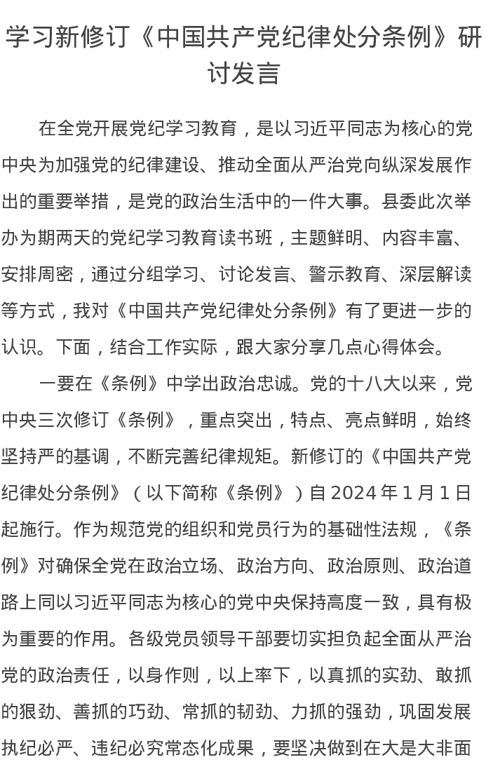 学习新修订《中国共产党纪律处分条例》研讨发言