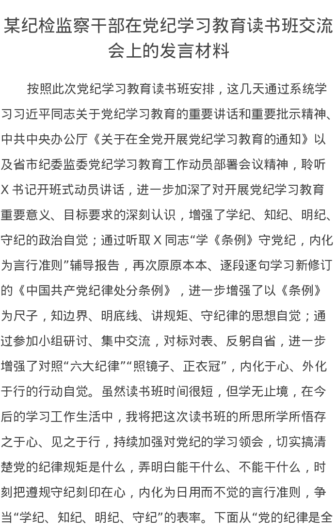 某纪检监察干部在党纪学习教育读书班交流会上的发言材料