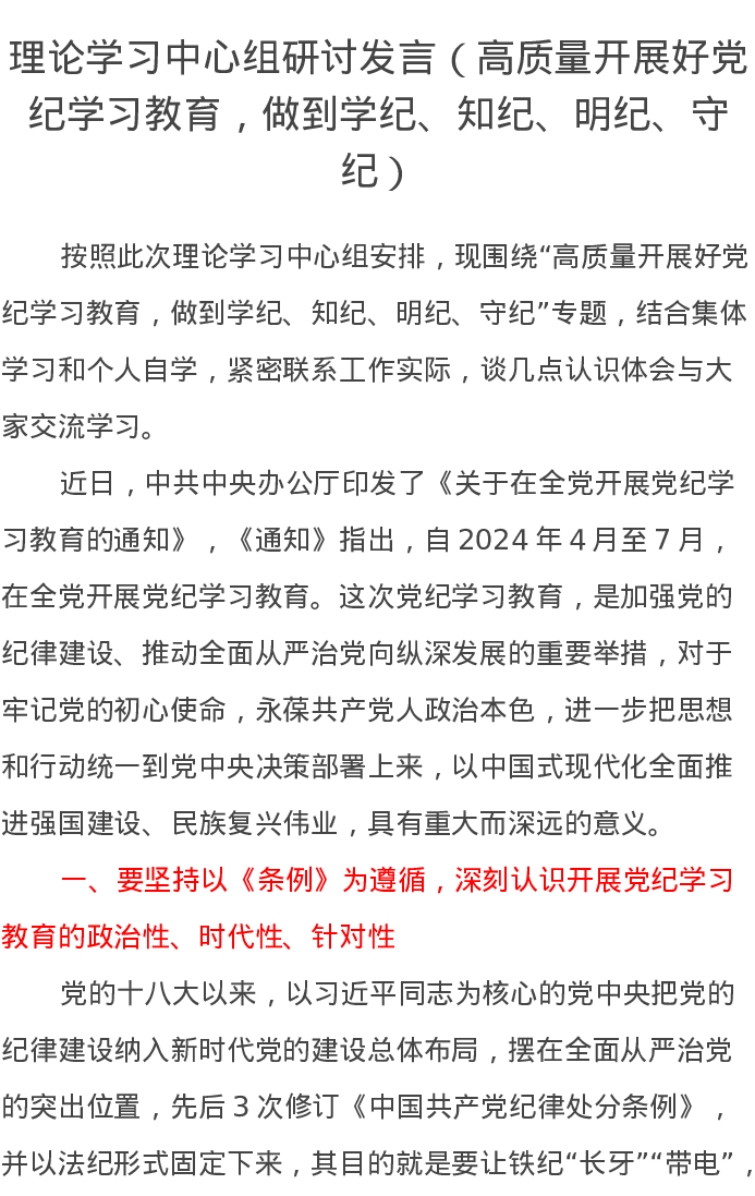 理论学习中心组研讨发言(高质量开展好党纪学习教育,做到学纪、知纪、明纪、守纪)