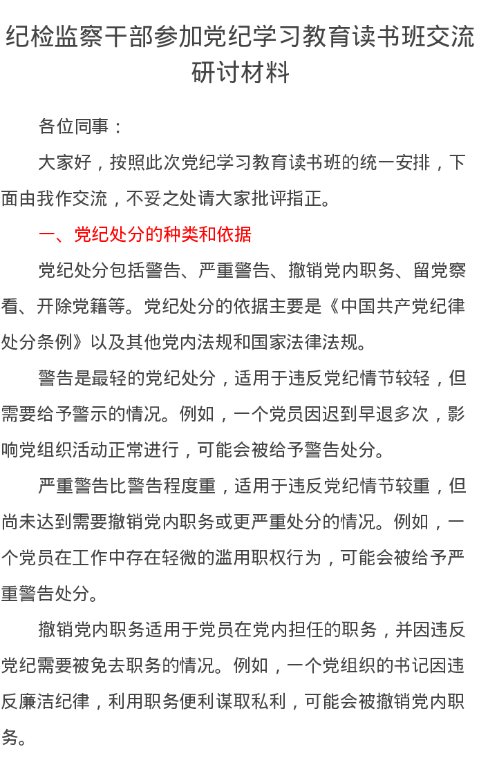 纪检监察干部参加党纪学习教育读书班交流研讨发言材料