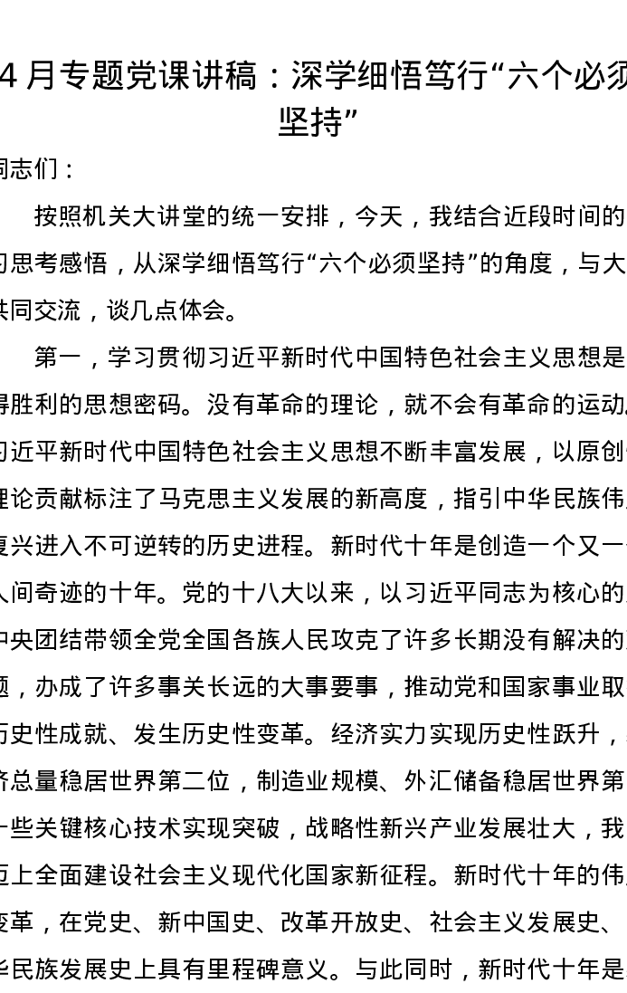 4月专题党课讲稿:深学细悟笃行“六个必须坚持”