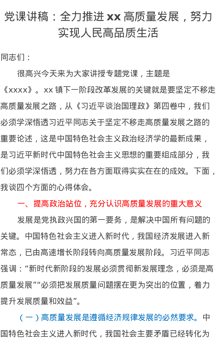 党课讲稿:全力推进xx高质量发展,努力实现人民高品质生活